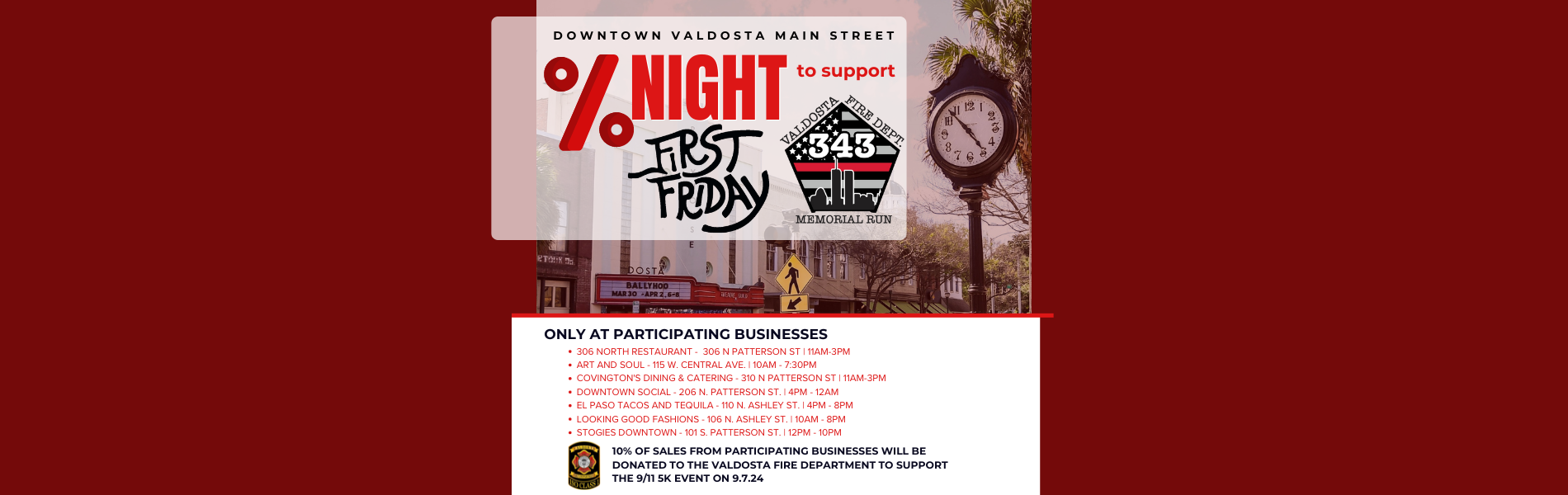 Join us for First Friday in Downtown Valdosta and enjoy Percentage Night! 🎉 Participating businesses are donating 10% of their sales to support the Valdosta Fire Department 9/11 5K 🚒. Make sure to visit Art and Soul Valdosta, Downtown Social, El Paso Tacos & Tequila, Looking Good Fashions, and Stogies Downtown, 306 North, Covington's Valdosta to shop for a great cause! 🛍️!